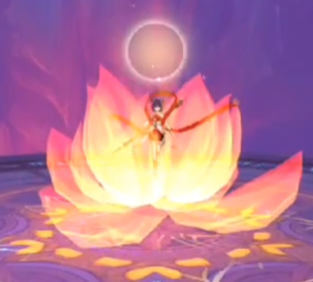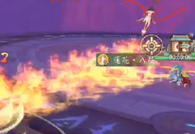 注:高傷AOE傷害,自身旋轉(zhuǎn)釋放一束連天火圈,狀態(tài)結(jié)束會有個插地結(jié)尾技能,此時,所有周圍玩家會被擊退??稍诨鹑磳⒔Y(jié)束時拉開距離?;鹑︶尫磐局?,可尋找攜帶蓮花之人,站在一起,降低所受傷害。