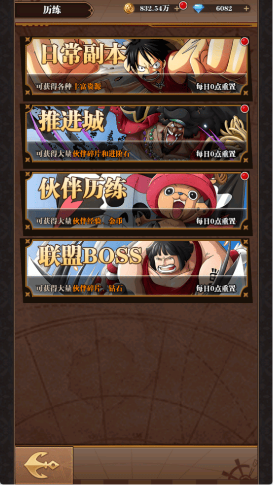 本游戲有非常多有意思的副本玩法,在推進城中首通層數(shù)可獲得大量伙伴碎片和進階石,掃蕩可獲得大量貝里和突破卡?;锇闅v練中可以可獲得大量伙伴經(jīng)驗、金幣。強者降臨:挑戰(zhàn)boss可以獲得鉆石、進階石和貝利。更有多種玩法,獲取豐富資源。還有更多副本玩法等你來發(fā)現(xiàn)!