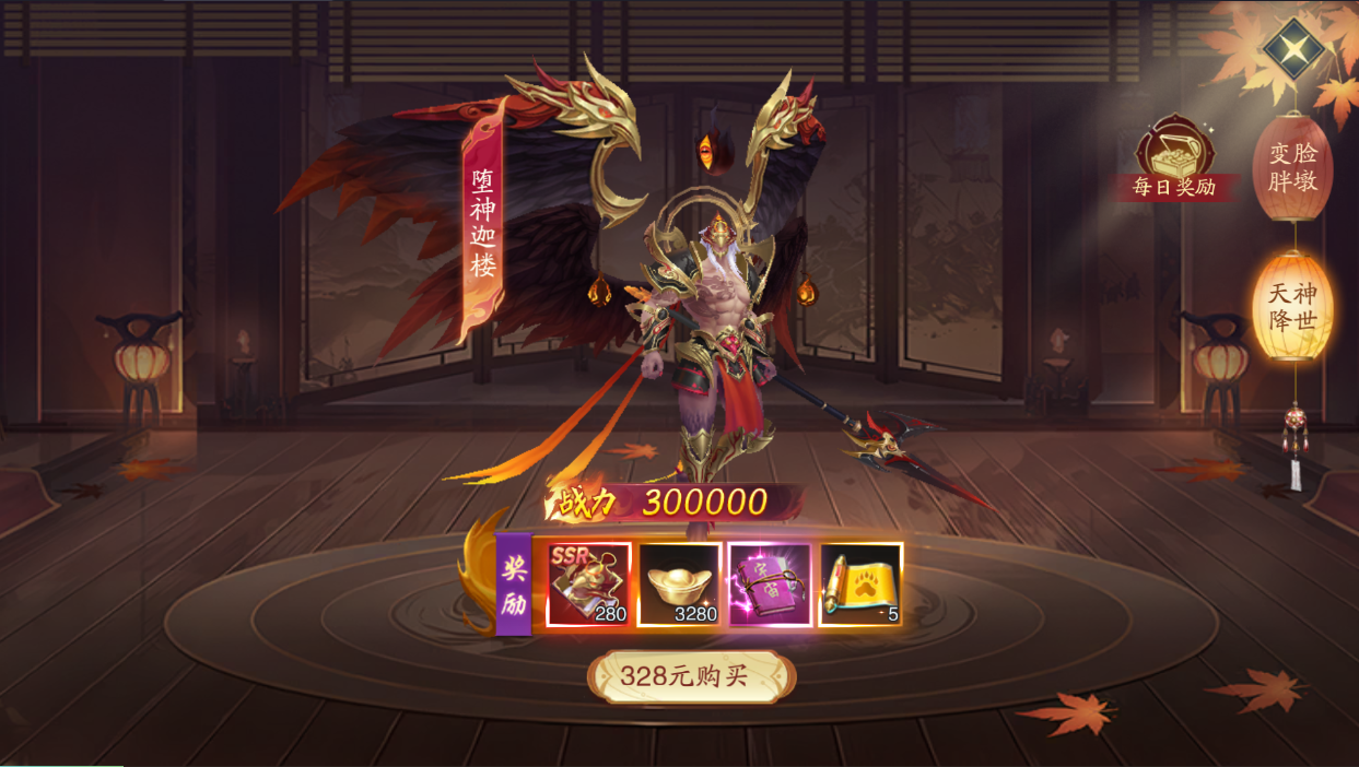 其次就是天神降世以及變臉胖墩兩個禮包,前期獲取一個SSR天神以及SSR寵物外觀,這些屬性都是直接加在角色上,而天神能夠讓你前期神擋殺神,平推大部分關卡,越戰(zhàn)力挑戰(zhàn)也是簡簡單單的